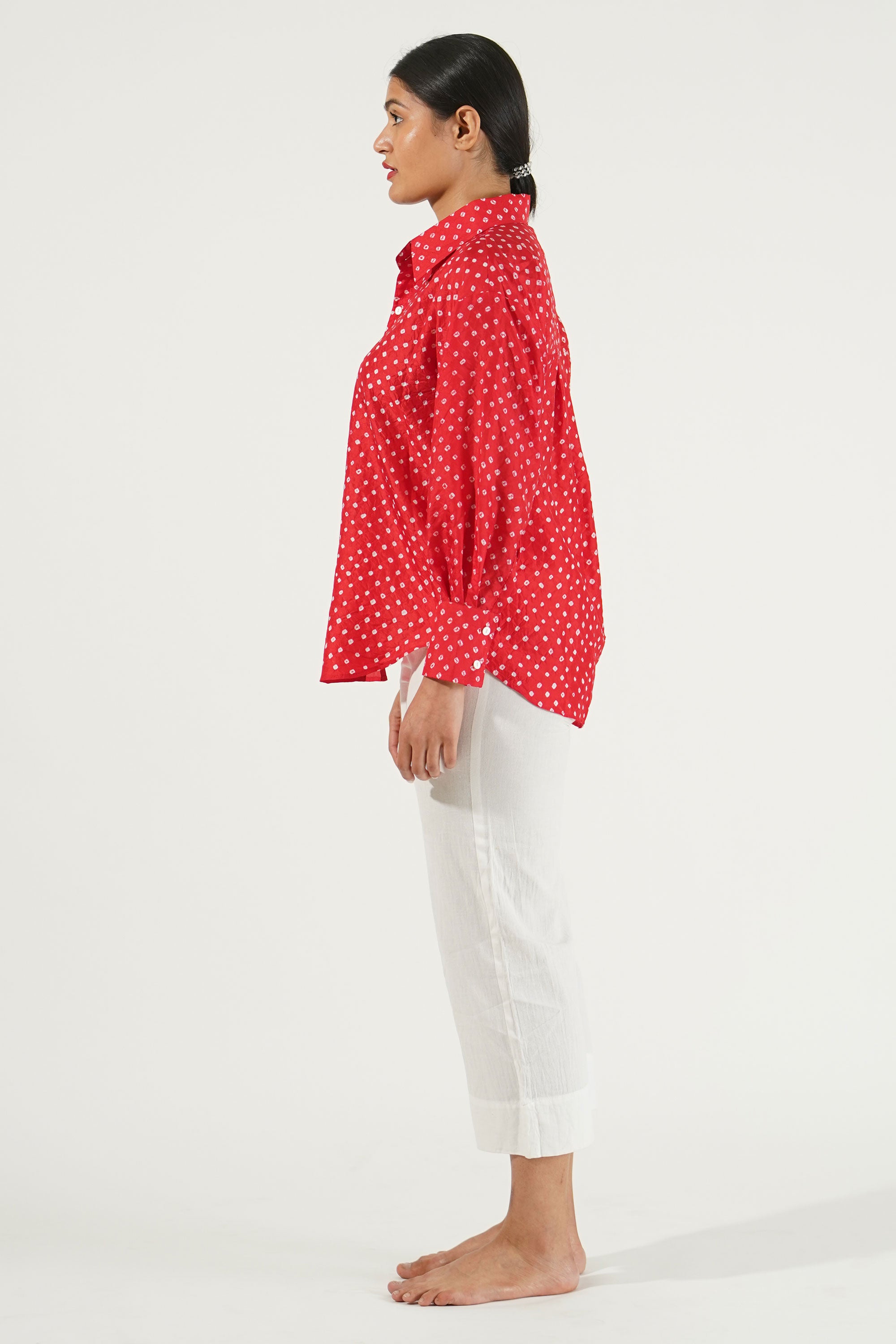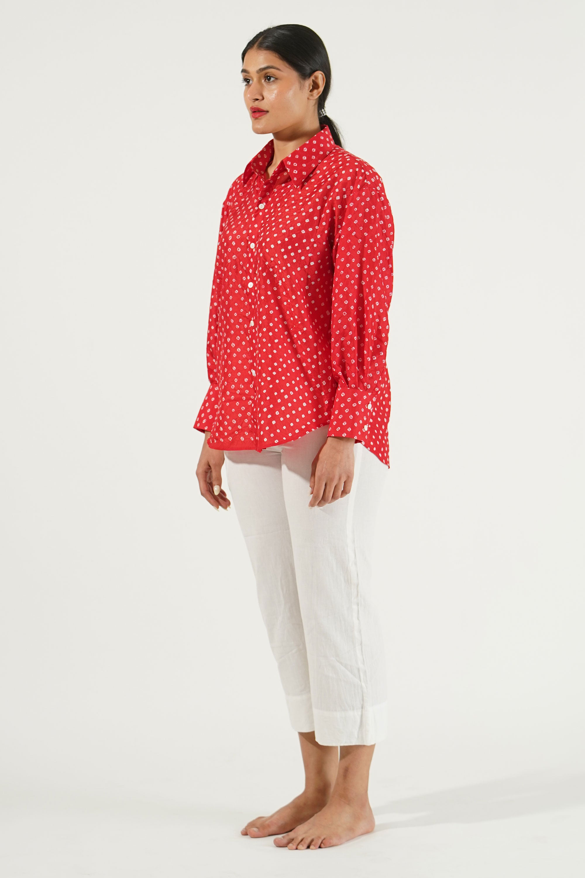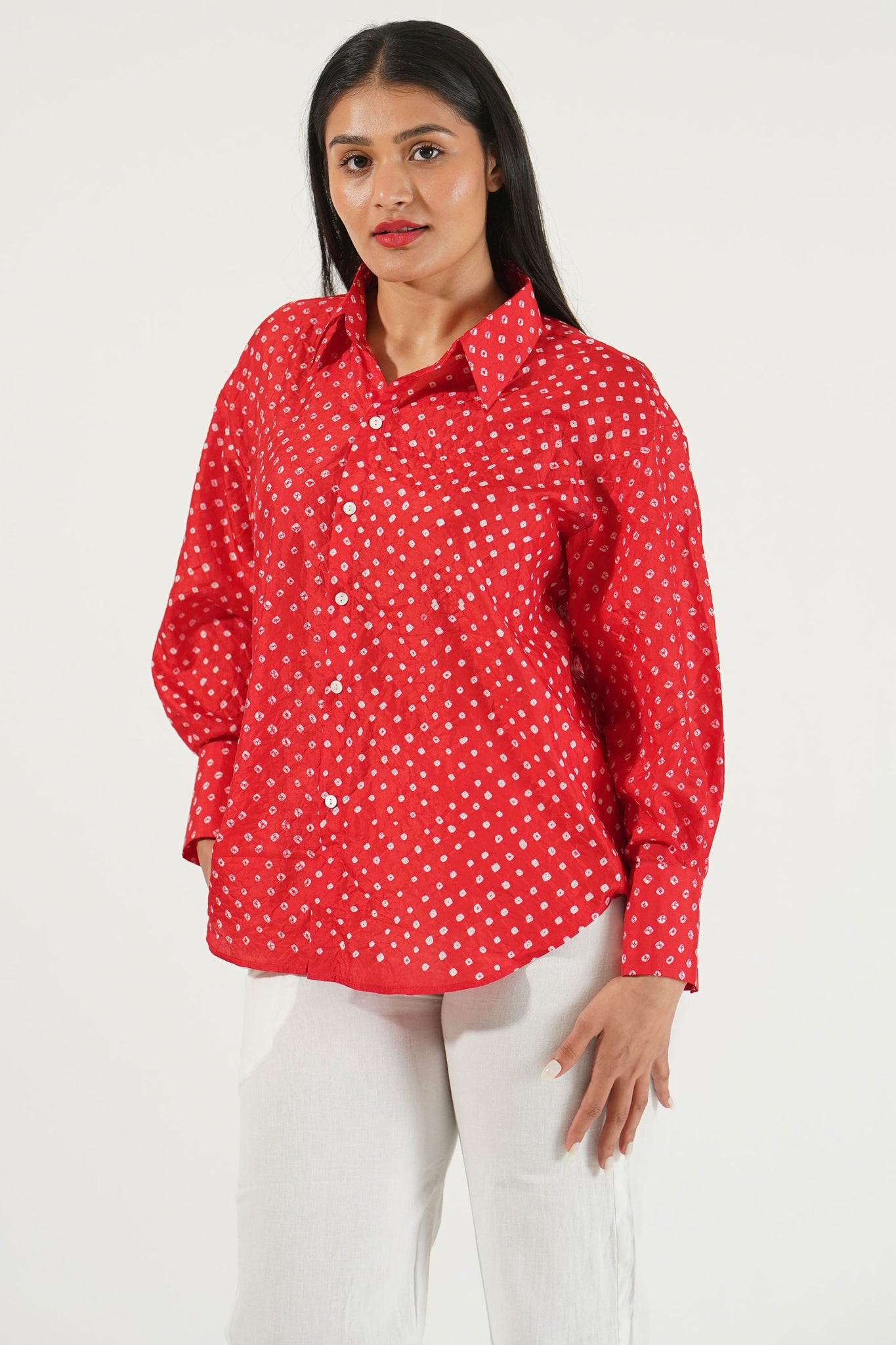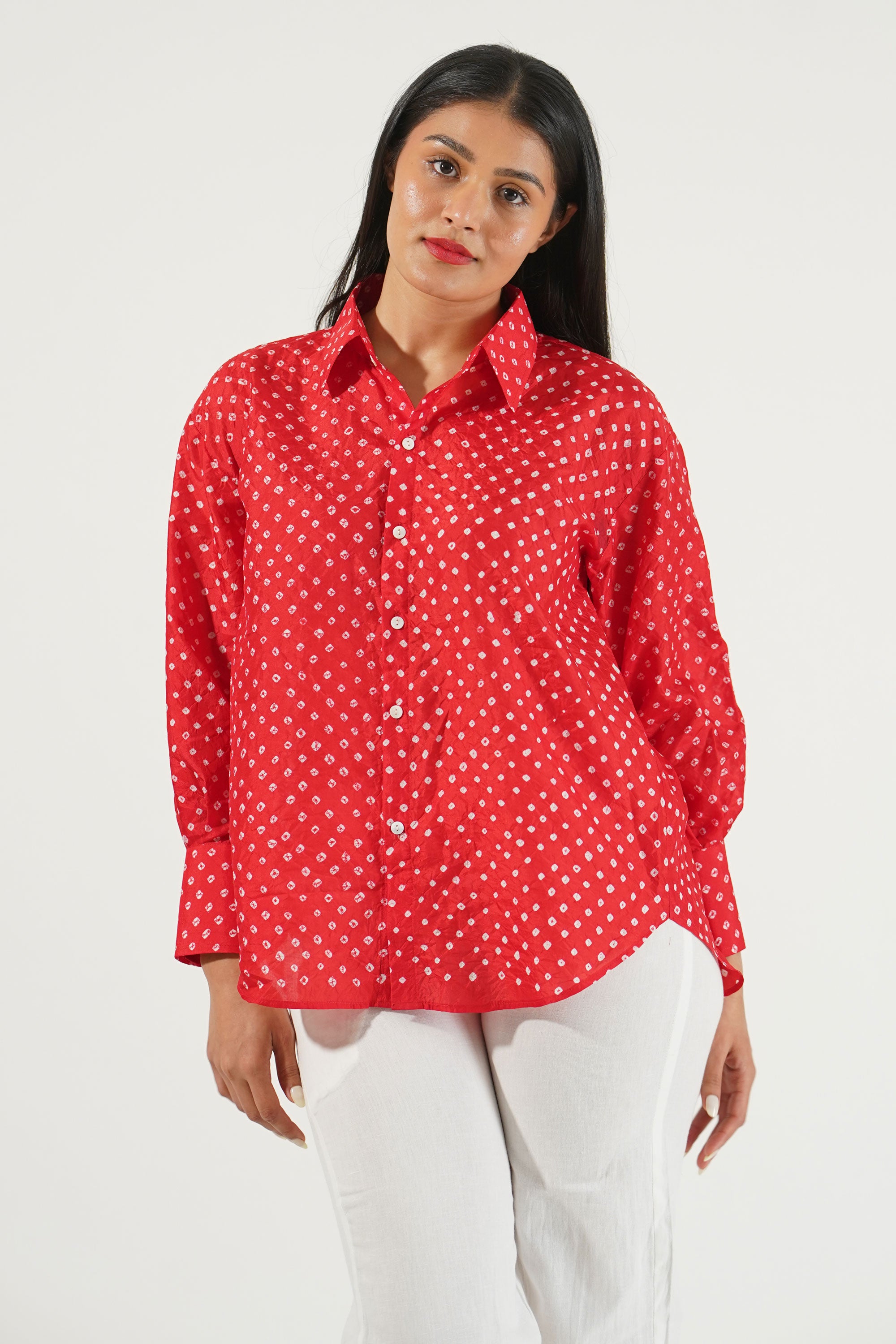 This one’s our twist on a classic a rich red Bandhani shirt that does the most without being loud. Softly puffed sleeves? ✔ Pleated cuffs? Of course. A modest neckline that still gives main character energy? Always 💅                                            Made in breathable fabric and handcrafted with love by our amazing artisans in Kutch 🧵
