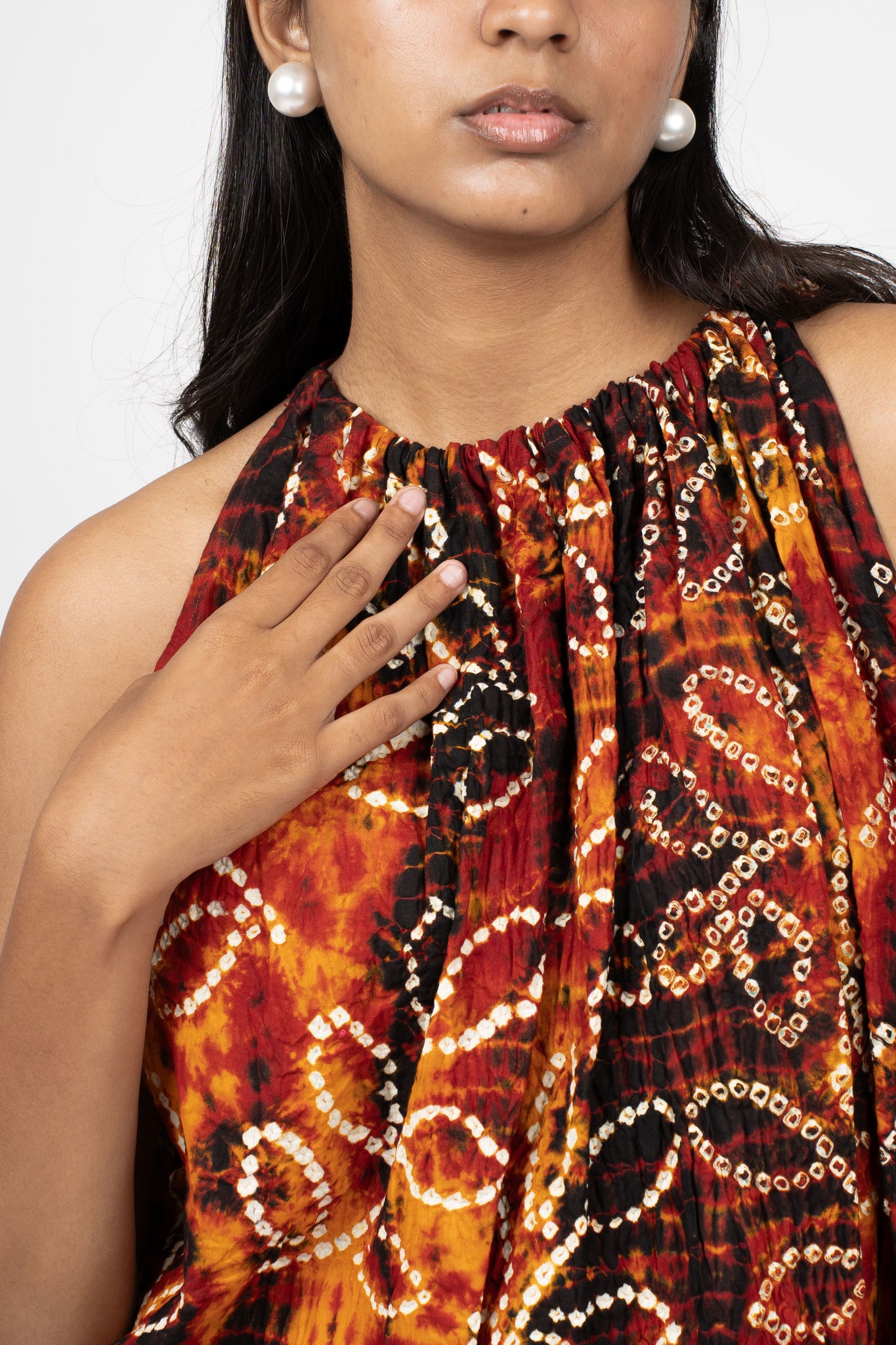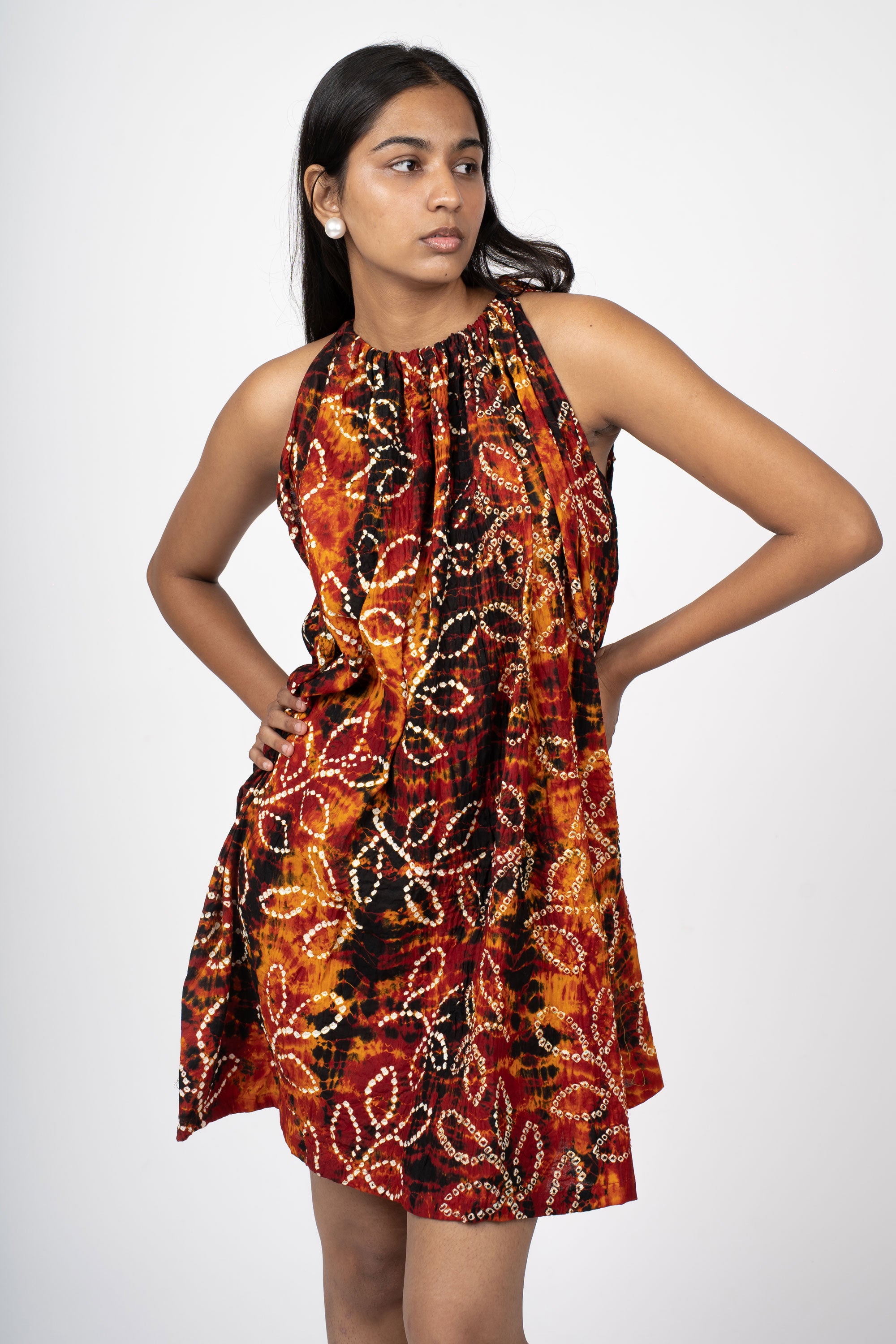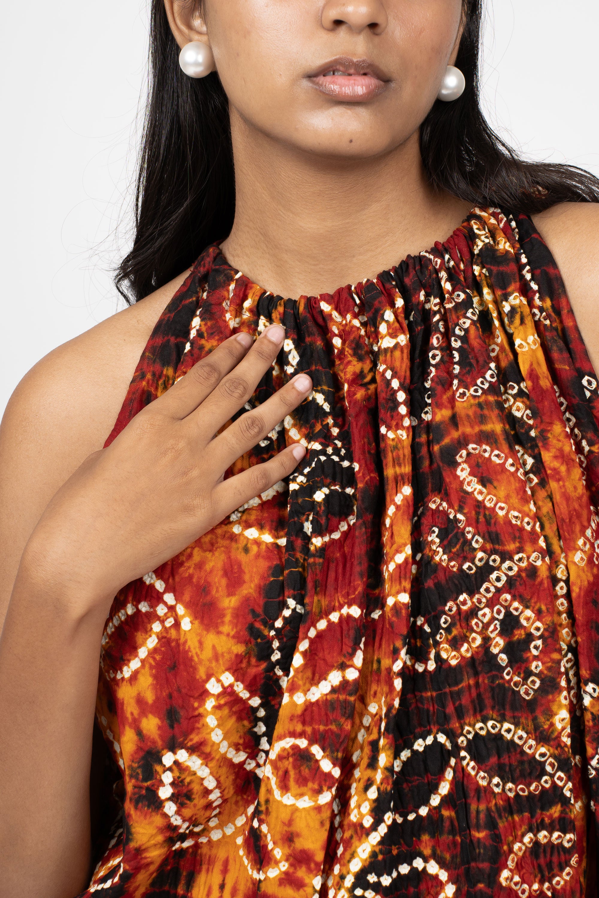 Bold and Beautiful, the Shibori tye dye dress with Amba Daad leaf pattern Bandhani , the perfect halter neck made with two unique textile techniques on one Cotton fabric!Β