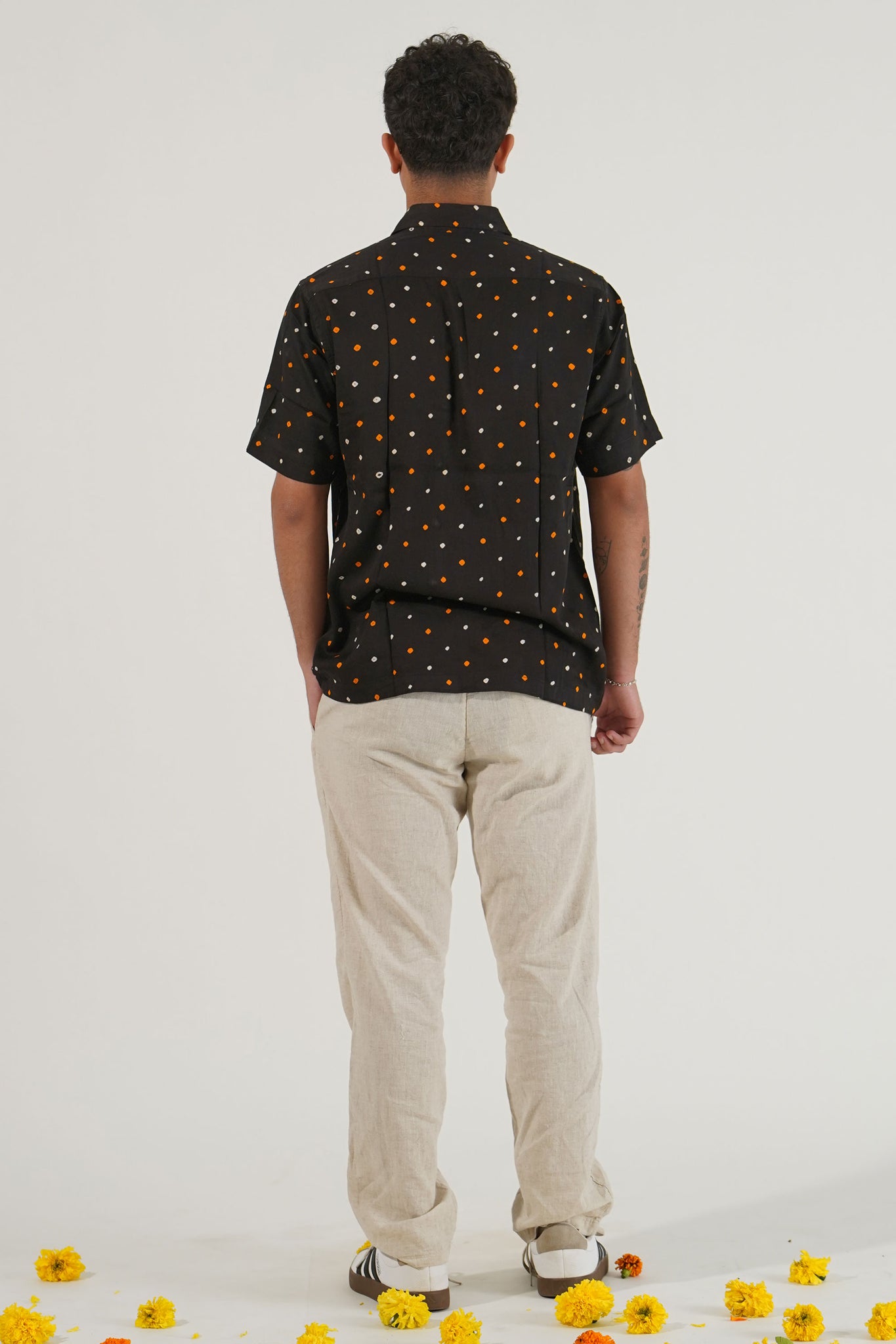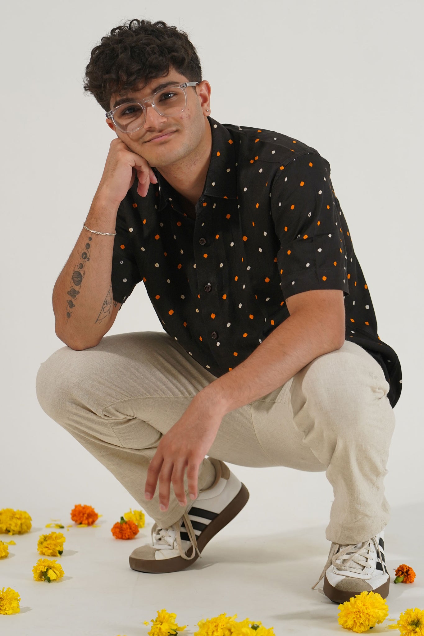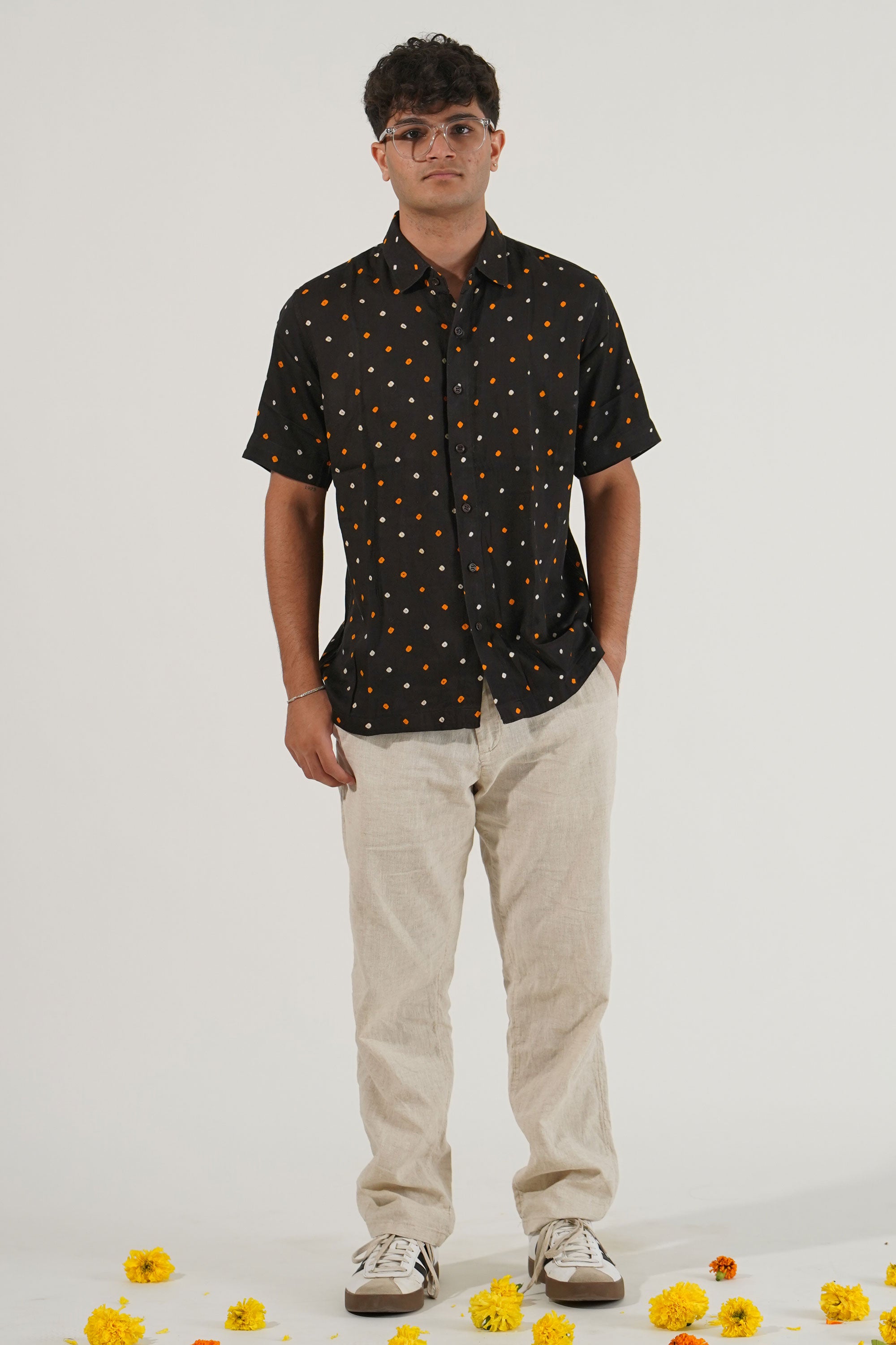 This half-sleeve cotton shirt brings that easy everyday feel with a crisp fit and a classic silhouette. The Bandhani in soft white and zesty orange adds just enough color to keep things interesting not too loud, but never boring.