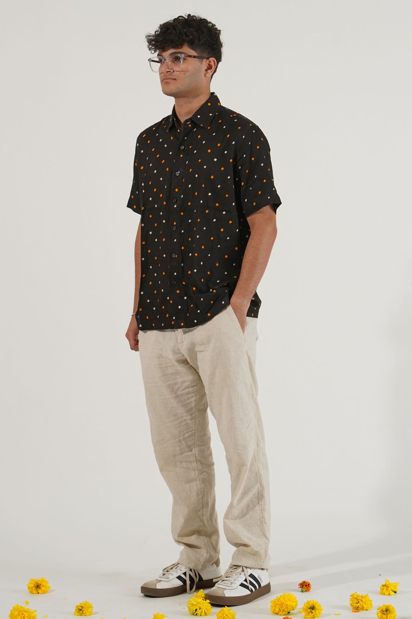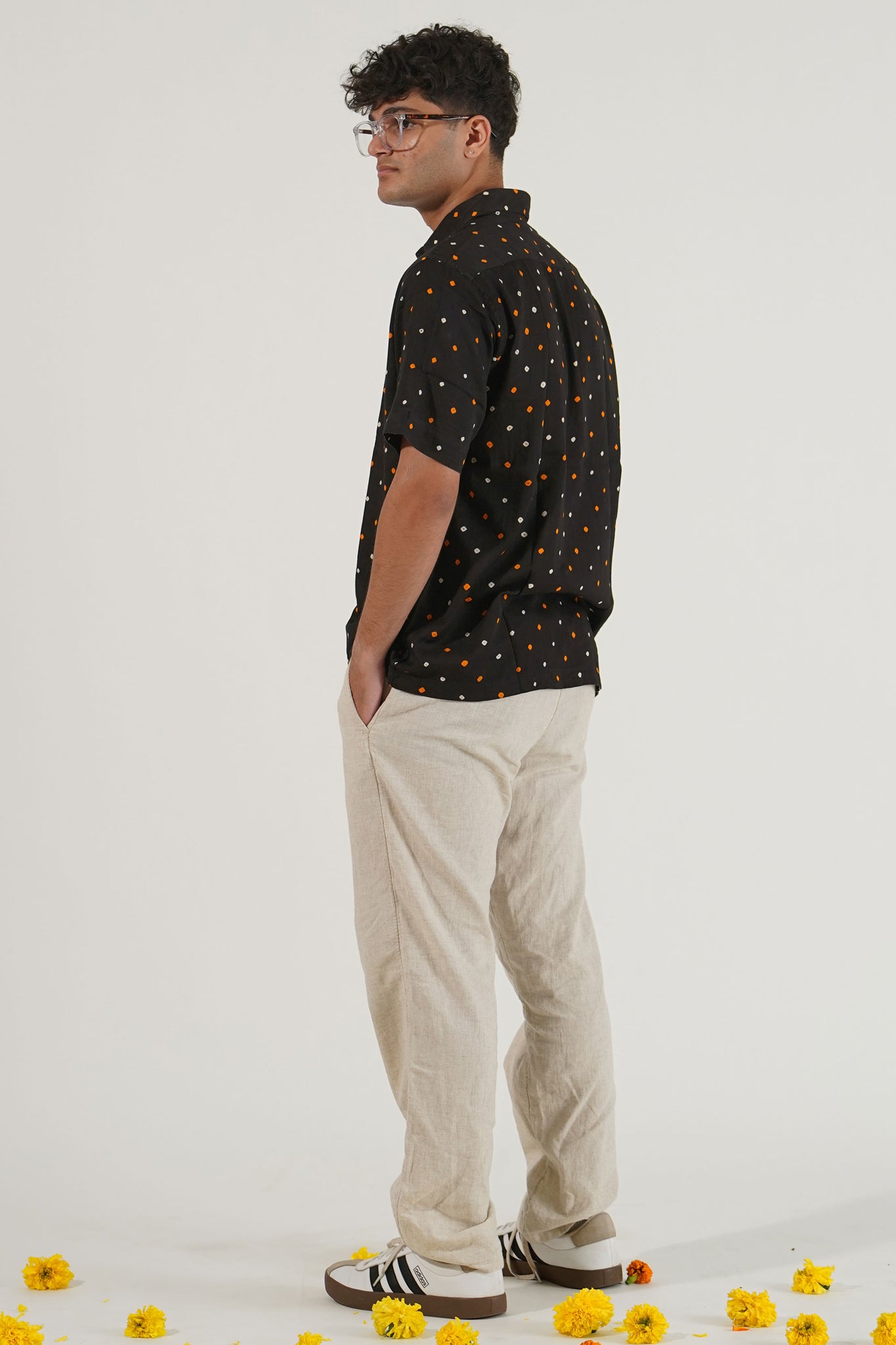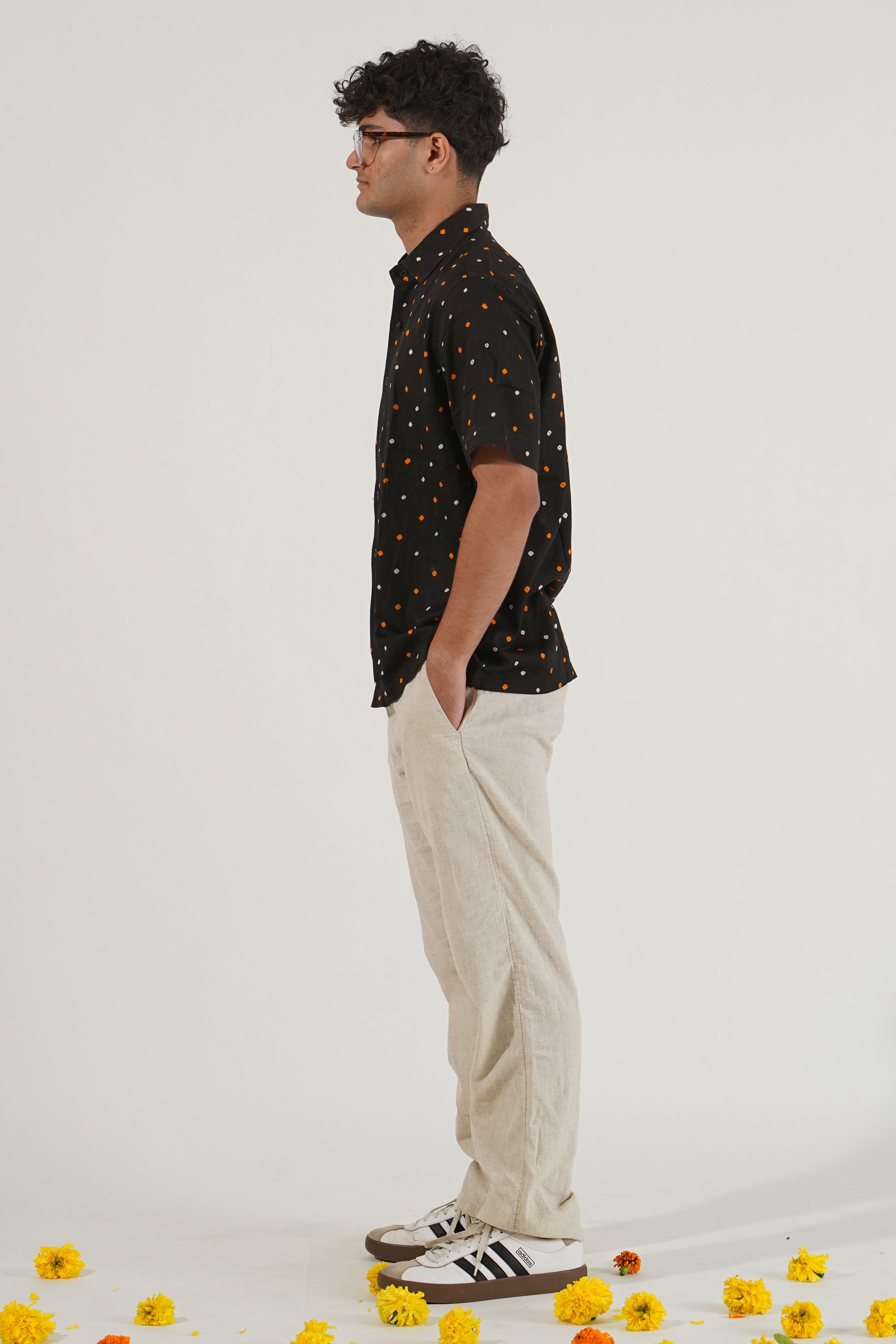 This half-sleeve cotton shirt brings that easy everyday feel with a crisp fit and a classic silhouette. The Bandhani in soft white and zesty orange adds just enough color to keep things interesting not too loud, but never boring.